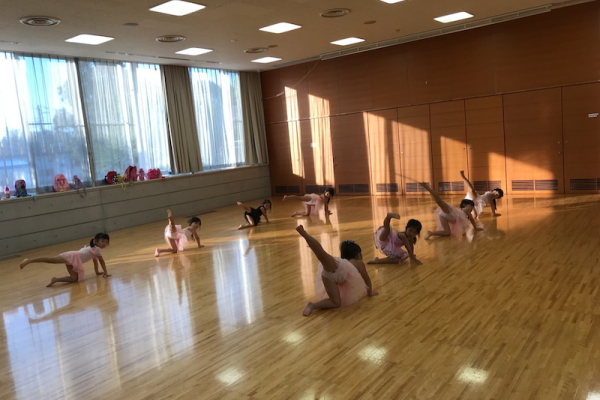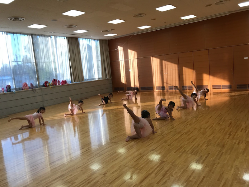 リズムに合わせて基礎動作の練習です。高学年になると複雑な動作を組合わせたレッスンになります。